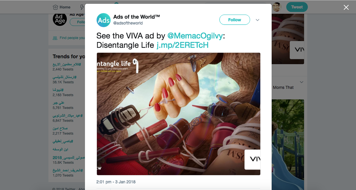 A print for Apple AirPods by VIVA Kuwait, offering it to their customers by simply adding it to their existing mobile plan. To highlight the advantage of wireless headphones, no more wire after today this was our concept